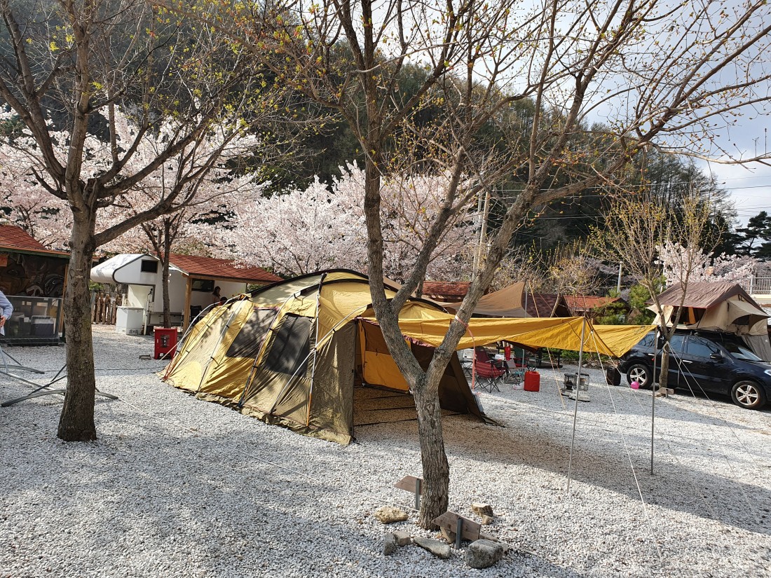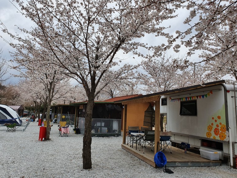 황토방 글램핑이 있는 E구역 전체구역에 벚꽃이 많이 핍니다.