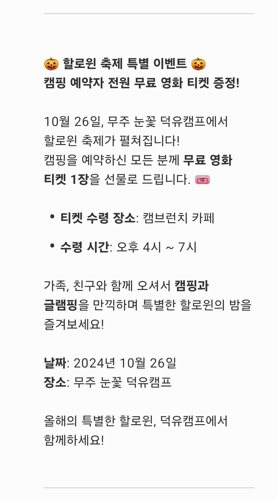 10월26일 할로윈 무료 영화티켓 페이지 정보 작성자 덕유캠프 댓글 0건 조회 2,497회 작성일 24-10-22 12:15 본문 10월26일 할로윈 무료 영화티켓 목록 이전글눈꽃 크림피자, 달콤 고구마피자, 고르곤졸라 피자 20% 할인이벤트 24.12.02 다음글7월27일 토요일 오후 8시 공연안내 24.07.14 댓글목록 댓글목록 등록된 댓글이 없습니다.